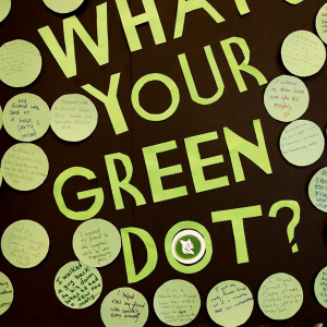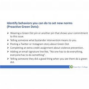 Proactive Green dots are words and actions that communicate two values: (1) sexual assault, dating violence, and stalking won’t be tolerated in our campus community, and (2) everyone has the responsibility to do their part.